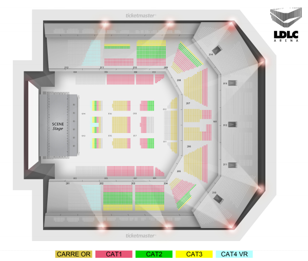 Carré Or : Places assises numérotées. Catégorie 1 : Places assises numérotées. Catégorie 2 : Places assises numérotées. Catégorie 3 : Places assises numérotées. Catégorie 4 - VR (Visibilité Réduite) : Places assises numérotées.