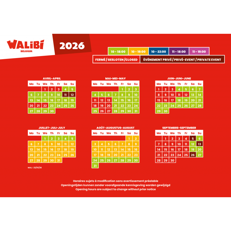 Billet non daté 1 jour Saison 2026 valable à partir du lendemain de la date d’achat pour 1 visite du 04/04/2026 au 03/01/2027 (selon calendrier d'ouverture à consulter www.walibi.be/fr et hors 05/09, 13/09, 25/12/2026 et 01/01/2027)