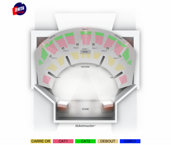 Carré or : places assises numérotées Catégorie 1 : places assises numérotées Catégorie 2 : places assises numérotées Fosse : placement libre debout Early : placement libre debout, accès 30 minutes avant l’ouverture des portes, priorité non garantie au-delà