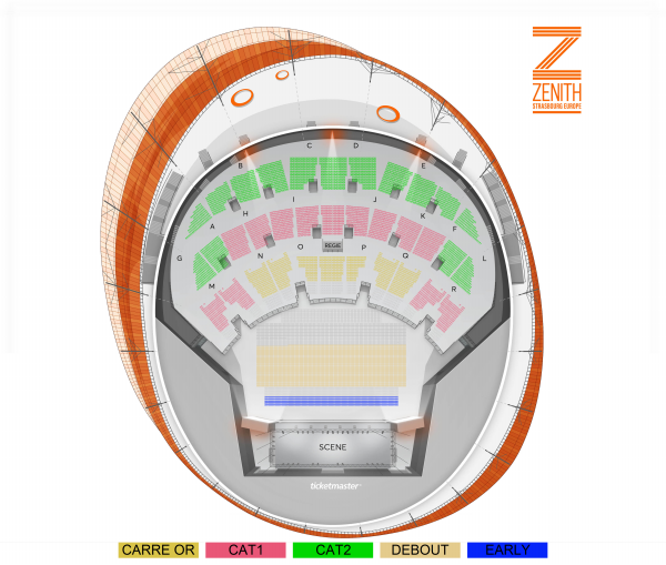 Carré or : places assises numérotées Catégorie 1 : places assises numérotées Catégorie 2 : places assises numérotées Fosse : placement libre debout Early : placement libre debout, accès 30 minutes avant l’ouverture des portes, priorité non garantie au-delà Contact PMR : infos.psh@label-ln.com
