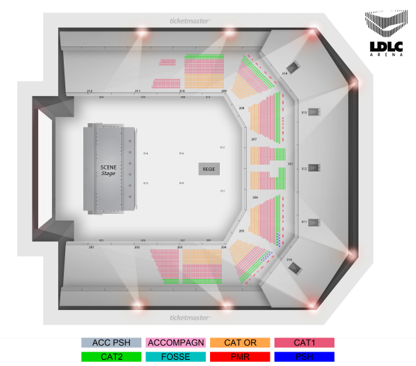 Catégorie Or : Places assises numérotées Catégorie 1 : Places assises numérotées Catégorie 2 : Places assises numérotées Fosse : Placement libre debout Personne en mobilité Réduite (PMR) : Personne ayant besoin d'un accès réservé et aménagé permettant l'installation de son fauteuil roulant dans une zone dédiée, afin de garantir un espace adapté, sécurisé et confortable. Un justificatif sera demandé à l'entrée. Accompagnateur PMR : une place réservée à une personne qui accompagne un spectateur en situation de handicap en fauteuil roulant. Personne en situation de Handicap (PSH) : Personne présentant un handicap et ayant besoin d'un siège réservé et garantissant un accès adapté, sécurisé et confortable. Un justificatif sera demandé à l'entrée. Vous avez la possibilité d'être accompagné.e dans la limite d'un accompagnant.