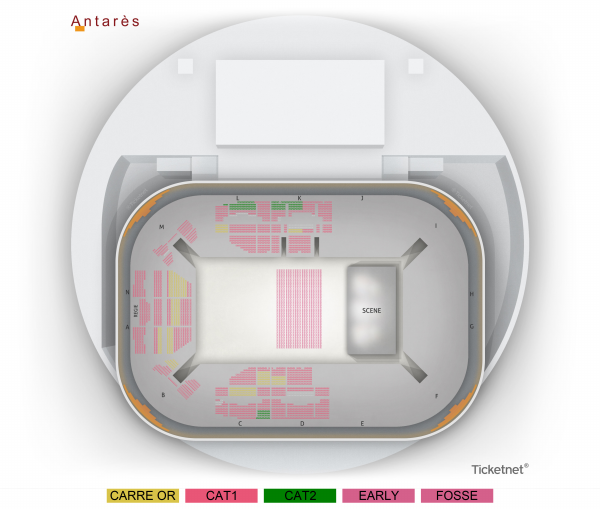 Catégorie Or : places assises numérotées Catégorie 1 : places assises numérotées Catégorie 2 : places assises numérotées Fosse : placement libre debout Early : placement libre debout en fosse - accès au site 30 min avant l'ouverture des portes, priorité non garantie au-delà.