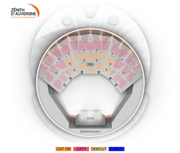 Early : Placement libre debout. Entrée prioritaire 30 min avant l'ouverture des portes Debout : Placement libre debout Catégorie Or : Places assises numérotées Catégorie 1 : Places assises numérotées