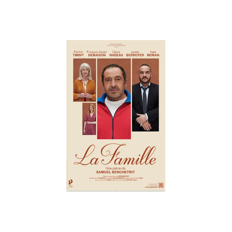 PASCAL LEGROS PRODUCTION PRÉSENTE : LA FAMILLE La Famille Un duo inédit avec Patrick Timsit et François-Xavier Demaison en frères ennemis Une famille dysfonctionnelle qui se voit peu, le père, la mère, les deux frères Max et Jérôme ainsi que son épouse Alice, vont devoir se réunir pour un événement qui va changer leur vie. La soirée promet bien des surprises entre incompréhension, rire et amour. Une pièce écrite et mise en scène par Samuel Benchetrit Avec Patrick Timsit, François-Xavier Demaison, Claire Nadeau, Jackie Berroyer, Kate Moran Décors Emmanuelle Roy Costumes Charlotte Betaillole Lumières ...