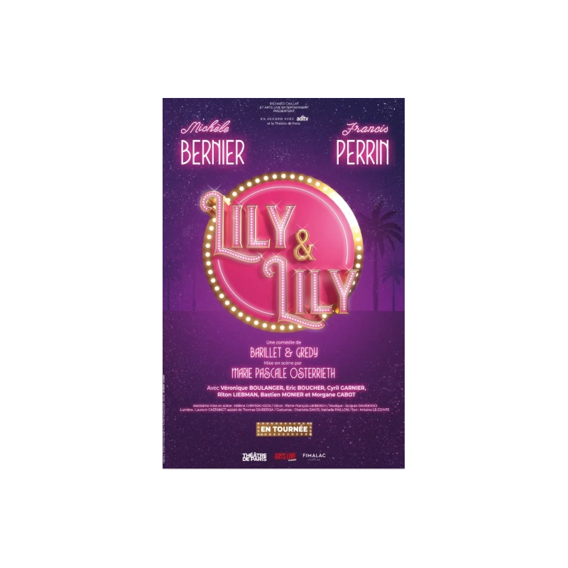 PASCAL LEGROS PRODUCTION PRÉSENTE : LILY & LILY LILY ET LILY Une comédie de BARILLET et GREDY Mise en scène par Marie Pascale OSTERRIETH Adaptation Marie Pascale OSTERRIETH et Michèle BERNIER Avec : Michèle BERNIER, Francis PERRIN, Véronique BOULANGER, Éric BOUCHER, Cyril GARNIER, Riton LIEBMAN, Bastien MONIER et Morgane CABOT Assistante mise en scène : Hélène CHRYSOCHOOS Décor : Pierre-François LIMBOSCH Musique : Jacques DAVIDOVICI Lumière : Laurent CASTAINGT assisté de Thomas GIUBERGIA Costumes : Charlotte DAVID, Nathalie PAILLON Son : Antoine LE COINTE INFOS Durée du spectacle : 2h Mention producteur : Richard CAILLAT – Arts Li