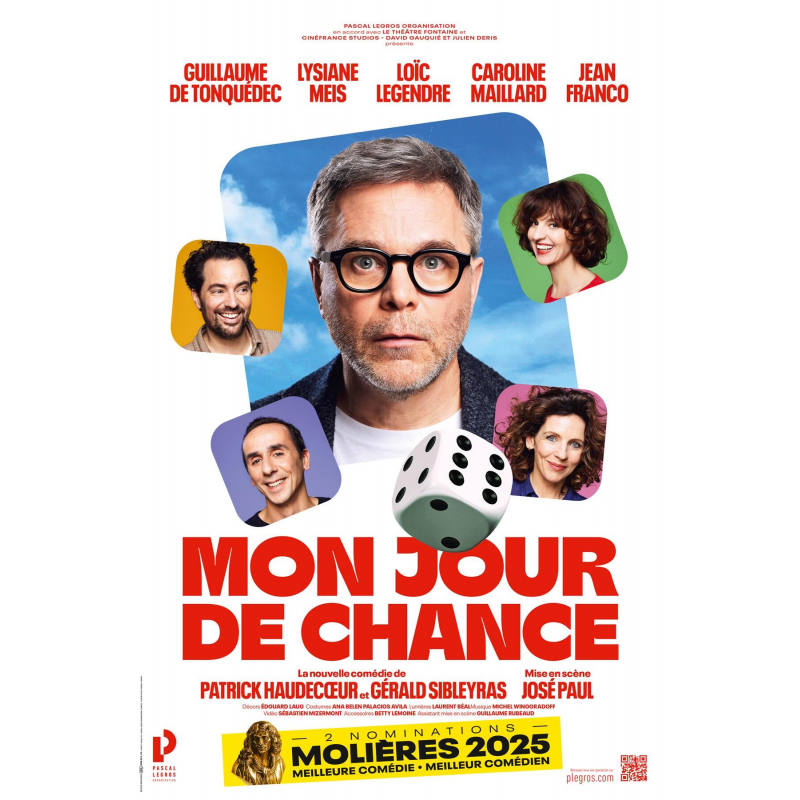 "Mon Jour de chance" Que feriez-vous si vous pouviez revenir en arrière et modifier le cours de votre vie ? Sébastien passe un week-end avec des amis d’enfance. Ils se souviennent qu’à l’époque ils laissaient le sort décider pour eux et prenaient toutes leurs décisions en jouant au dé. Sébastien se rappelle précisément d’un soir où il a fait un quatre. Si seulement il avait fait un six, sa vie aurait été bien plus belle. Il en est convaincu. Et si le destin lui donnait l’occasion de rejouer ? Une pièce de Patrick Haudecœur et Gérald Sibleyras Mise en scène José Paul Avec Guillaume de Tonquédec, Loïc Legendre, Lysiane Meis, Jean Franco, Caroline Maillard Décors Édouard Laug Costumes Ana Belen Palacios Avila Lumière Laurent Béal Musique Michel Winogradoff Vidéo Sébastien Mizermont Accessoiristes Betty Lemoine Assistant à la mise en scène Guillaume Rubeaud Crédits photos : © Guillaume Thomas © Bernard Richebé Mentions : Théâtre Fontaine et Pascal Legros Organisation en coproduction avec Cinéfrance Studios – David Gauquié et Julien Deris 2 nominations aux Molières : meilleure comédie et meilleur comédien pour Guillaume de Tonquédec