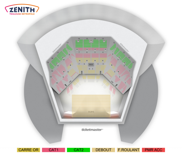 Carré or, catégorie 1, catégorie 2 : Places assises numérotées Catégorie Debout : Placement libre debout en fosse