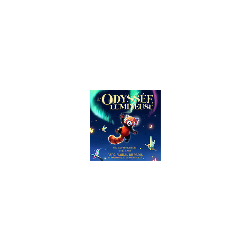 L'ODYSSEE LUMINEUSE Du 19 novembre 2025 au 11 janvier 2026. Billet daté valable sur la séance choisie. Prévente Ticketmaster et son réseau de partenaires du 03 au 10 octobre. L’Odyssée Lumineuse – Un voyage féérique au Parc Floral de Paris Une balade magique entièrement renouvelée vous attend, où le Parc Floral de Paris s’illumine de nouvelles œuvres lumineuses monumentales. Laissez-vous émerveiller par les incontournables aurores boréales, déjà plébiscitées par des milliers de visiteurs. Cette année, un temps fort viendra sublimer la promenade : trois spectacles de drones lumineux chaque soir, à 18h45, 19h45 et 20h45*. Un rendez-vous exceptionnel, à partager en famille ou entre amis, où poésie et technologie se rencontrent pour créer des souvenirs inoubliables. * Les spectacles de drones sont une expérience offerte aux visiteurs et dépendent des conditions météorologiques (pluie, vent). En cas d’annulation, les billets ne sont ni échangés ni remboursés. Pour vous éviter ce type de désagrément, nous vous conseillons d’opter pour le billet OPEN, qui vous permet de choisir librement votre jour de visite selon la météo.