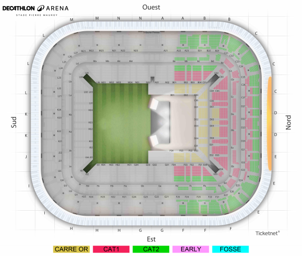 Carré or : places assises numérotées Catégorie 1 : places assises numérotées Catégorie 2 : places assises numérotées Fosse : placement libre debout Early : placement libre debout. Accès 30 minutes avant l’ouverture des portes, priorité non garantie au-delà.