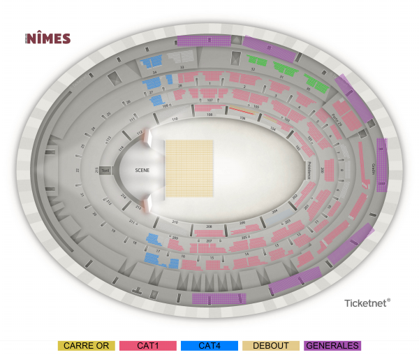 Placement mixte: Catégorie 1 : Places assises numérotées Catégorie 2 : Places assises numérotées Catégorie 4 : Places assises numérotées Debout : Placement libre debout Générales : Placement libre assis