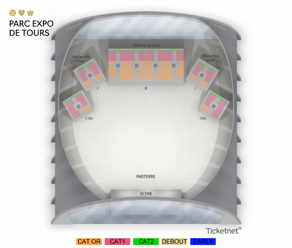 Carré or : Places assises numérotées. Catégorie 1 : Places assises numérotées. Catégorie 2 : Places assises numérotées. Fosse : Placement libre debout. Early : Accès prioritaire 30 min avant l'ouverture des portes, priorité non garantie au-delà