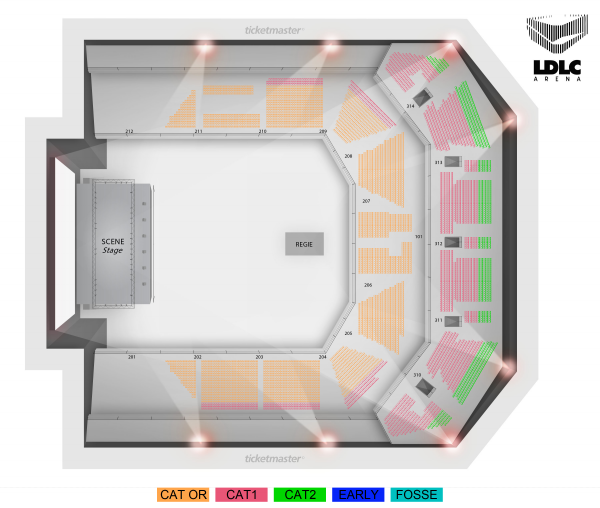 Catégorie Or : Places assises numérotées. Catégorie 1 : Places assises numérotées. Catégorie 2 : Places assises numérotées. Fosse : Placement libre debout. Early Entrance : Placement libre debout. Accès 30 minutes avant l’ouverture des portes, priorité non garantie au-delà.