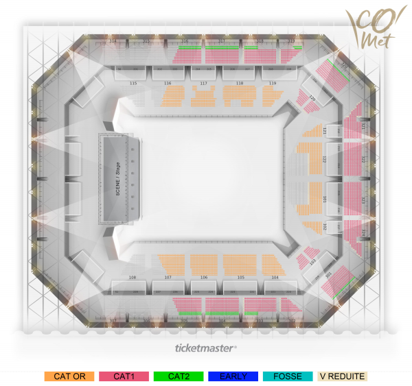 Catégorie Or : places assises numérotées Catégorie 1 : places assises numérotées Catégorie 2 : places assises numérotées Fosse : placement libre debout Early : Accès prioritaire 30min avant l'ouverture des portes, priorité non garantie au-delà. VR : Visibilité réduite