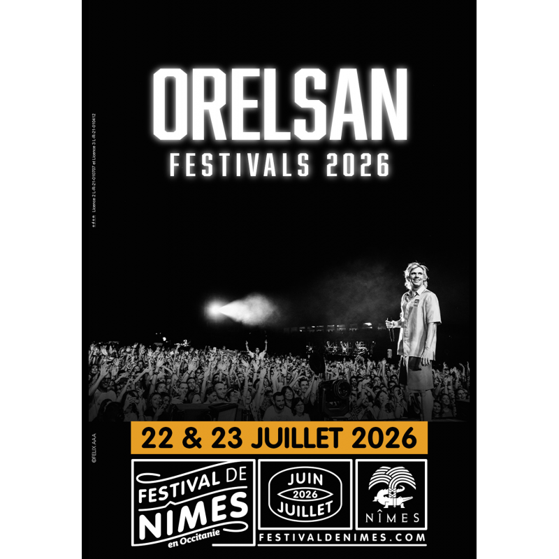 ADAM CONCERTS PRESENTE : ORELSAN ORELSAN se produira au Festival de NÎMES les Mercredi 22 & Jeudi 23 Juillet 2026 ! Le rappeur normand fera vibrer les mythiques Arènes avec un spectacle inédit, encore plus fort et inattendu. Entre flow incisif, textes puissants et mise en scène grandiose, préparez-vous à deux soirées exceptionnelles avec l’un des artistes les plus marquants de sa génération. Ouverture de la billetterie tous réseaux le Vendredi 24 Octobre 2025 à 10h00