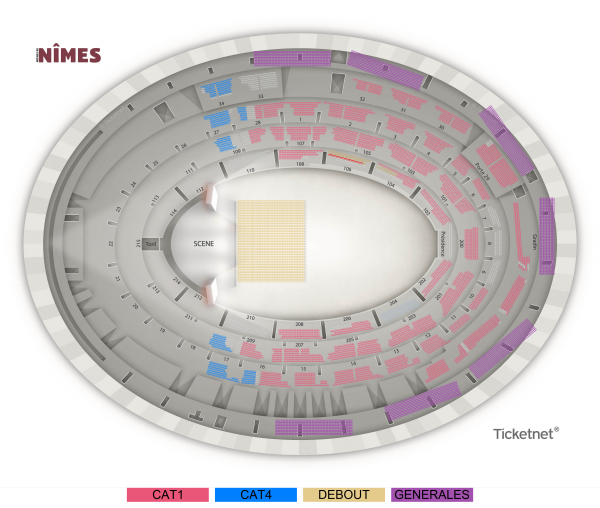 Placement mixte: Catégorie 1 : Places assises numérotées Catégorie 4 : Places assises numérotées Debout : Placement libre debout Générales : Placement libre assis