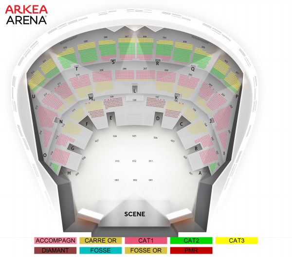 Diamant : places assises numérotées Carré or : places assises numérotées Catégorie 1 : places assises numérotées Catégorie 2 : places assises numérotées Catégorie 3 : places assises numérotées Fosse or : placement libre debout devant la scène Fosse : placement libre debout