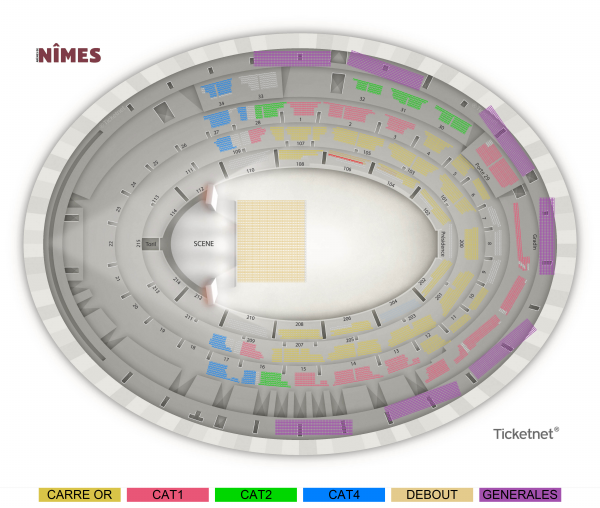 Placement mixte: Carré OR : Places assises numérotées Catégorie 1 : Places assises numérotées Catégorie 4 : Places assises numérotées Debout : Placement libre debout Générales : Placement libre assis