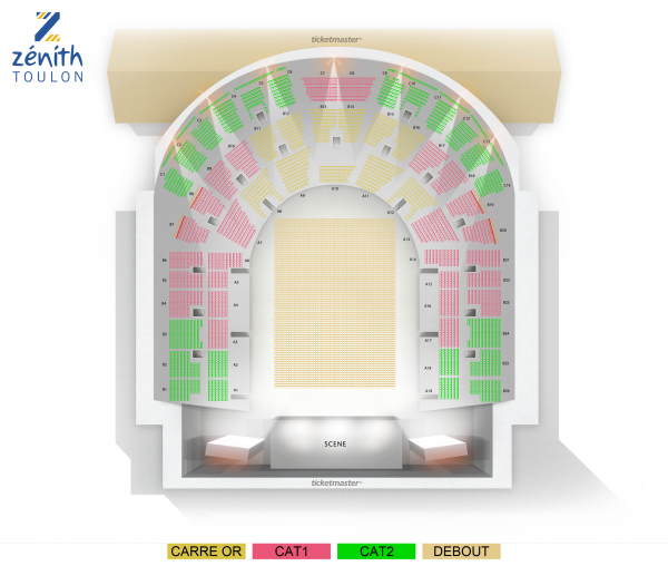 Carré Or : Places assises numérotées Catégorie 1 : Places assises numérotées Catégorie 2 : Places assises numérotées Debout : Placement libre debout