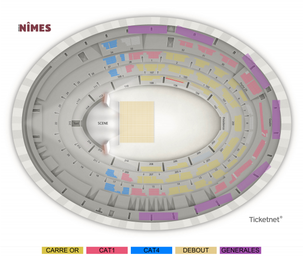 Placement mixte: Catégorie 1 : Places assises numérotées Catégorie 4 : Places assises numérotées Debout : Placement libre debout Générales : Placement libre assis