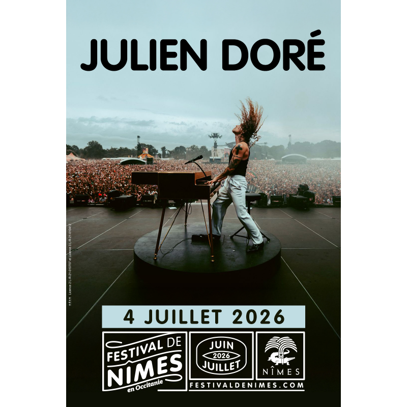 ADAM CONCERTS PRESENTE : JULIEN DORE JULIEN DORÉ sera au Festival de Nîmes le Samedi 4 Juillet 2026 ! Julien Doré est aujourd’hui une figure incontournable de la scène française avec près de 15 ans d’une carrière sans faute. 5 fois lauréat aux Victoires de la Musique, cet auteur/compositeur/interprète n’en finit plus de nous faire danser avec ses tubes « Paris-Seychelles », « Coco Câline », « Les limites », « Le lac », en passant par des hymnes multigénérationnels imparables comme « Nous » ou encore « La fièvre ». Julien Doré c’est aussi 3 tournées de concerts joués à guichets fermés, des millions de spectateurs et des centaines de dates en France mais également au Canada, au Japon et en Allemagne…