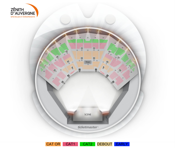 Catégorie Or : Places assises numérotées Catégorie 1 : Places assises numérotées Catégorie 2 : Places assises numérotées Fosse : Placement libre debout Fosse Early Access : Placement libre debout - Accès prioritaire 30 min avant l'ouverture des portes, priorité non garantie au delà.