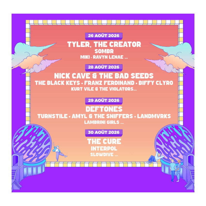 ROCK EN SEINE a dévoilé les premiers noms de sa programmation et nous avons le plaisir de vous donner rendez-vous du 26 au 30 août prochain au Domaine national de Saint-Cloud avec Tyler, the Creator, Nick Cave & the Bad Seeds, The Cure, Deftones, The Black Keys, Turnstile ... et de nombreux autres artistes !