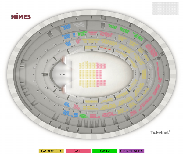 Placement mixte: Catégorie OR : Places assises numérotées Catégorie 1 : Places assises numérotées Catégorie 2 : Places assises numérotées Générales : Placement libre assis