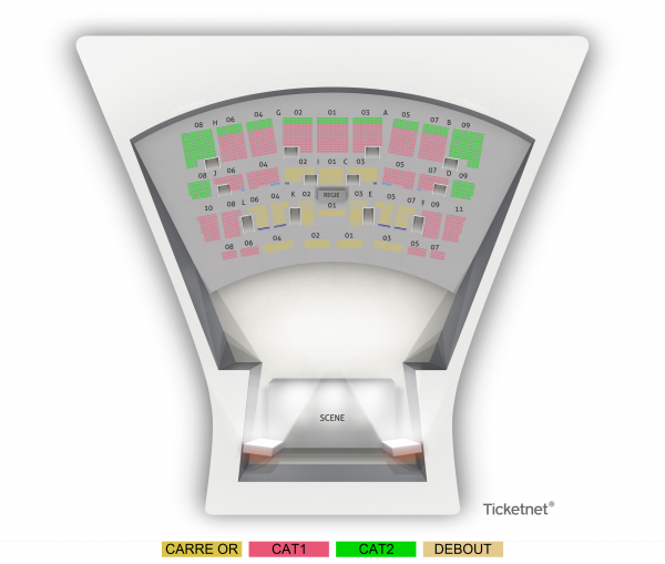 Carré Or : Places assises numérotées Catégorie 1 : Places assises numérotées Catégorie 2 : Places assises numérotées Debout : Placement libre debout
