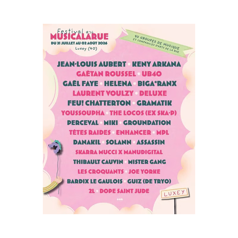 ASSOCIATION MUSICALARUE PRÉSENTE : FESTIVAL MUSICALARUE - 3 JOURS Horaires d'ouverture : Enceinte arts de la rue à 15h00 / Enceinte musique à 18h00. Festival gratuit pour les enfants de moins de 10 ans (nés à partir du 31/07/2016), la date anniversaire devant avoir lieu au plus tard pendant le festival. Le billet exonéré est à retirer aux guichets sur présentation d’une pièce d’identité. Les mineurs non accompagnés ne sont pas autorisés dans l’enceinte du festival. Musicalarue accueille un public familial, tant pour les spectacles d’arts de la rue que pour les concerts. Toutefois, pour des raisons de sécurité et de santé, le festival est fortement déconseillé aux enfants de moins de 3 ans. Contact PMR : psh@musicalarue.com PROGRAMMATION VENDREDI Jean-Louis Aubert / Keny Arkana / Gaël Faye / Gramatik / MPL / Joe Yorke / Thibault Cauvin / Bardix le Gaulois / Les Croquants / Dope Saint Jude ... SAMEDI Laurent Voulzy / UB40 / Feu Chatterton / Miki / Enhancer / Groundation / Youssoupha / Têtes Raides / Skarra Mucci x Manudigital / Guiz (de Tryo) / ... DIMANCHE Gaëtan Roussel / Helena / Biga*Ranx / Deluxe / The Locos (Ex Ska-P) / Solann / Danakil / Assassin / Perceval / Mister Gang / 2L...
