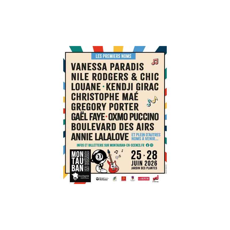 GRAND MONTAUBAN COMMUNAUTÉ D'AGG PRÉSENTE : MONTAUBAN EN SCENES Le Montauban en Scènes, c’est 4 soirées de concerts réunissant près de 22 artistes au total sur 2 scènes au Jardin des plantes et un « village du festival » accessible de 17h30 à 2h du matin pour se restaurer et se détendre. Venez vite découvrir ou redécouvrir cet évènement incontournable de la région. " Et pour la programmation : ?? PROGRAMMATION DE L’ÉDITION 2026 • JEUDI 25 JUIN : LOUANE + KENDJI GIRAC + STYLETO + ETIENNE DE CRECY • VENDREDI 26 JUIN : VANESSA PARADIS + GAEL FAYE + OXMO PUCCINO • SAMEDI 27 JUIN : NILE RODGERS & CHIC + GREGORY PORTER + ANNIE LALALOVE • DIMANCHE 28 JUIN : CHRISTOPHE MAE + BOULEVARD DES AIRS + BREAKBOT & IRFANE + KAVINSKY L'ouverture des portes se fait dès 17h00.