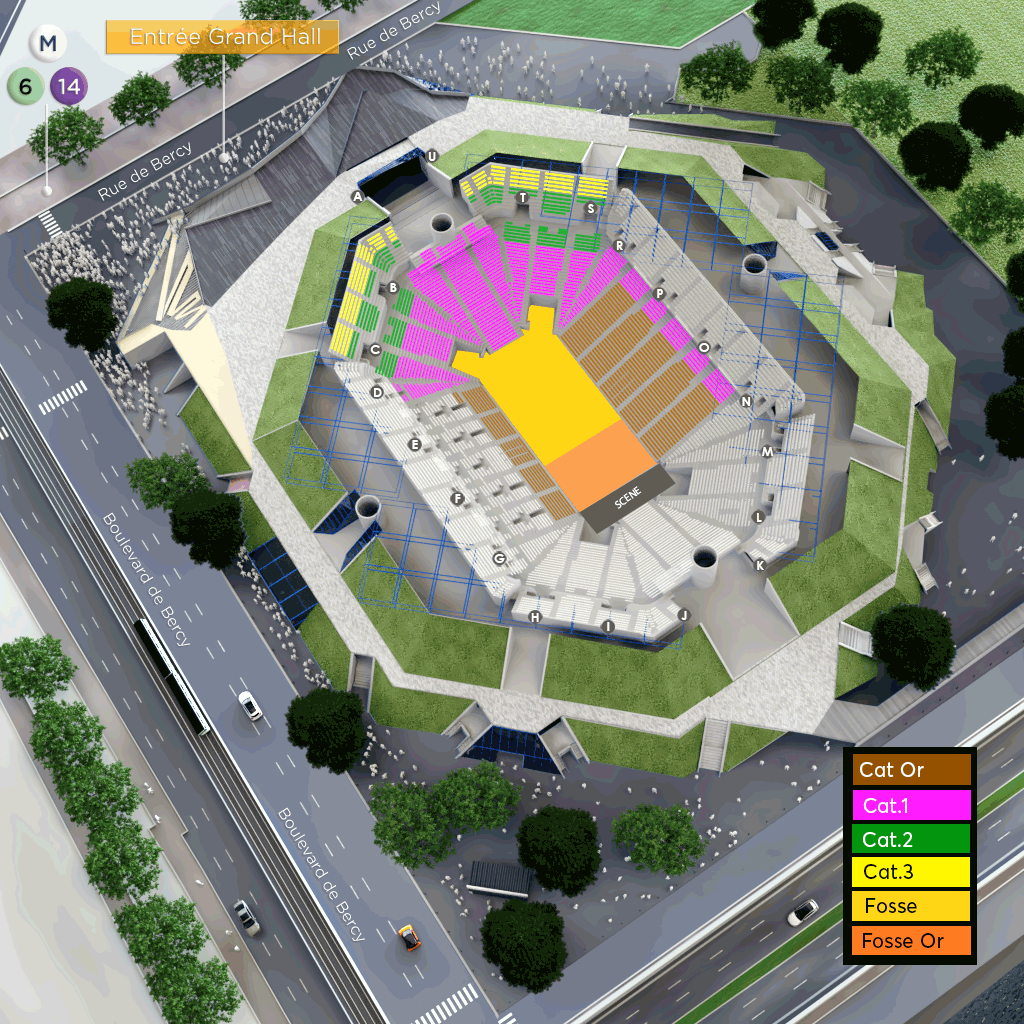 Placement mixte : - Catégories Or, 1, 2 et 3 : votre placement est assis numéroté, - Fosse Or et Fosse : votre placement est debout. - Attention! Du fait de la modularité de la salle la numérotation des gradins est inversée Le rang 01 est donc le plus éloigné de la scène l'orchestre et les balcons ont une numérotation normale - Tous les spectateurs doivent impérativement être en possession d'un billet, y compris les enfants quel que soit leur âge. - La réservation des places PMR / PSH et accompagnateurs est disponible par téléphone au 01.46.91.57.54.