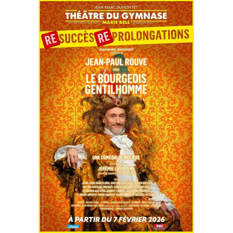 LE BOURGEOIS GENTILHOMME Première du spectacle : Le 07-02-2026 Monsieur Jourdain rêve en grand : il veut devenir un « gentilhomme ». Quand un simple bourgeois se débat pour accéder à la haute-société et imiter la noblesse, les faux-semblants valsent, les intrigues naissent, les précepteurs défilent et les quiproquos s’enchaînent… Des Turcs s’invitent, on arrange des mariages, on dispute les voyelles et les consonnes dans une valse de perruques poudrées et de costumes flamboyants. Retrouvez Jean-Paul Rouve, dans cette comédie baroque, dansante et chantante. Équipe artistique : Mise en scène : Jérémie Lippmann assisté de Sarah Gellé et Sarah Recht Scénographie et décors : Jacques Gabel Costumes : Jean-Daniel Vuillermoz Perruques : Catherine Saint-Sever Musique : David Parienti Lumières : Jean-Pascal Pracht Chorégraphe : Tamara Fernando Distribution : Jean-Louis Barcelona, Gauthier Battoue, Julien Boclé, Taylor Chateau, Michaël Cohen, Hugues Delamarlière, Eleonora Galasso, Audrey Langle, Joséphine Meunier, Florent Operto, Marie Parisot, Marie Parouty, Héloïse Vellard, Jean-Paul Rouve Revue de presse : « Molière va au bout de chaque vanne, la pousse jusqu’à l’absurde. » PARIS MATCH « Cette version chantante et dansante, riche de costumes flamboyants et de décors colorés, se veut une immersion joyeuse. » NOTRE TEMPS « On sait qu’on va s’amuser. C’est coloré, c’est joyeux, c’est chevelu. » TF1, Bonjour ! La Matinale « Les enseignants de France et de Navarre peuvent emmener leurs ouailles au Théâtre Antoine les yeux fermés. » LE FIGARO « Ça va être drôle, ça va être coloré, ça va être génial. » BFM TV « Jean-Paul Rouve se glisse dans le costume du ‘Bourgeois gentilhomme’, campant avec finesse un Monsieur Jourdain candide, entouré par une troupe formidable. » LE POINT « On peut dès maintenant se divertir de l’énergie bon enfant de Jean-Paul Rouve. » TELERAMA « Cette nouvelle adaptation mêle théâtre, musique, chant et danse dans un esprit festif et visuellement éclatant. » SORTIR A PARIS « Jean-Paul Rouve prête ses traits au Bourgeois gentilhomme, formidablement naturel, au phrasé accessible. » LE NOUVEL OBS Jean-Paul Rouve « Son grand retour dans le classique de Molière a en effet de quoi marquer la rentrée théâtrale. » VSD MAGAZINE « Jean-Paul Rouve n’a qu’un objectif, nous faire rire. » Sandrine Blanchard, LE MONDE « Difficile de faire mieux » Marin de Viry, FIGARO MAGAZINE Durée : Environ 1h45