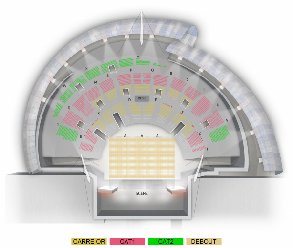 Carré Or : Places assises numérotées Catégorie 1 et 2 : Places assises numérotées Debout : Placement libre debout