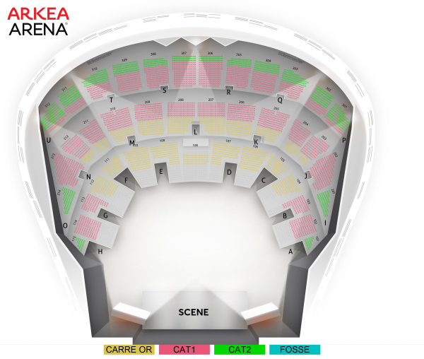 Placement mixte Carré or : places assises numérotées Catégorie 1 : places assises numérotées Catégorie 2 : places assises numérotées Fosse : placement libre debout