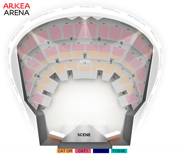 Catégorie Or : places assises numérotées Catégorie 1 : places assises numérotées Fosse : placement libre debout Early : Accès prioritaire 30min avant l'ouverture des portes, priorité non garantie au-delà.