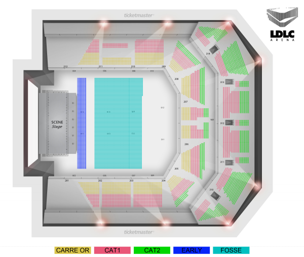 Carré or : Places assises numérotées Catégorie 1 : Places assises numérotées Catégorie 2 : Places assises numérotées Catégorie 2 Côté Scène : Places assises numérotées. Visibilité réduite sur le fond de scène. Fosse : Placement libre debout Early Entrance : Placement libre debout. Accès 30 minutes avant l’ouverture des portes, priorité non garantie au-delà