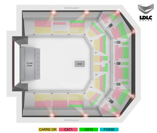 Catégorie Or : Places assises numérotées. Catégorie 1 : Places assises numérotées. Catégorie 2 : Places assises numérotées. Fosse : Placement libre debout.