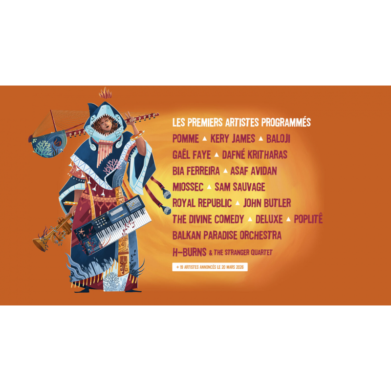 QUAI OUEST MUSIQUES PRÉSENTE : FESTIVAL DU BOUT DU MONDE - 2 JOURS PASS 2 JOURS - 1 ET 2 AOUT 2026 Pass 2 jours incluant l'entrée au festival du 31 juillet au 02 août. Billet à échanger contre un bracelet à l'entrée du festival VENDREDI 31 JUILLET BALOJI - BIA FERREIRA - KERY JAMES - POMME... SAMEDI 1ER AOUT BALKAN PARADISE ORCHESTRA - DELUXE - JOHN BUTLER - POPLITE - ROYAL REPUBLIC - THE DIVINE COMEDY... DIMANCHE 2 AOUT ASAF AVIDAN - DAFNE KRITHARAS - GAËL FAYE - MIOSSEC - SAM SAUVAGE...