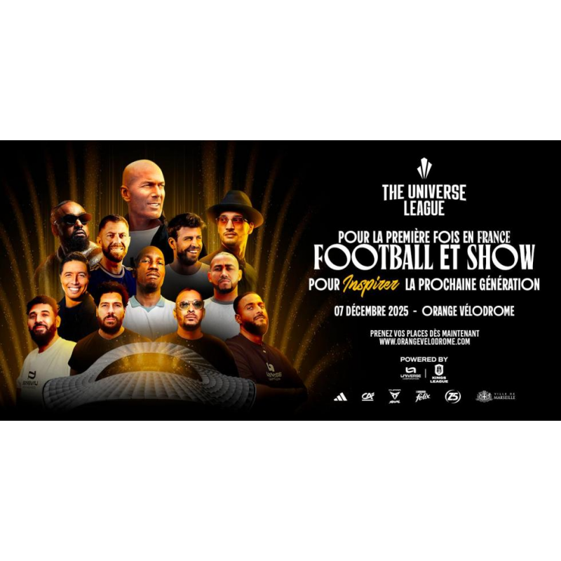 **UNIVERSE LEAGUE ORANGE VÉLODROME – MARSEILLE** Là où les légendes reviennent écrire l’histoire Le 7 décembre 2025, Marseille deviendra la capitale mondiale du football et du spectacle. L’Orange Vélodrome accueillera un événement unique en France, porté par Universe Football & Kings League : un show total où football, musique et culture fusionnent pour offrir une expérience inédite. Zidane revient fouler la pelouse de l’Orange Vélodrome Zinédine Zidane fera son retour sur la pelouse mythique de l’Orange Vélodrome. Face à lui, Gerard Piqué et une armée de légendes qui ont marqué plusieurs générations. Parmi les premiers noms confirmés : Didier Drogba, Dimitri Payet, Robert Pirès, Blaise Matuidi, Jay-Jay Okocha, Kevin Gameiro, Souleymane Diawara, Adil Rami, Jérémy Ménez, Nene, Taye Taiwo, Mevlüt Erdinç, Christophe Jallet, Mamadou Niang, Marcel Dib… Des joueurs qui ont écrit l’histoire du football, chacun à leur manière, réunis pour un show que personne n’aurait imaginé. Une soirée XXL entre football & spectacle Au programme : Un match Kings League France, explosif et spectaculaire Deux matchs de légendes, un choc Marseille x Paris, puis Madrid x Barcelone Un match créateurs France x International, regroupant les plus grands créateurs foot du moment Un rythme non-stop. Une tension permanente. Un show construit minute par minute pour faire vibrer 67 000 personnes. Des performances musicales exclusives Entre les matchs, l’Orange Vélodrome se transformera en scène géante avec : Soolking Alonzo Et bien d’autres à venir… Un événement porté par une vision et un engagement L’Universe League soutient l’Association Des Coccinelles Rouges pour Thomas, 1€ par billet sera reversé à l’association. Au-delà du spectacle, l’événement porte une mission : transmission, inclusion, impact social, donner accès au rêve. C’est l’ADN d’Universe Football. Réserve ta place maintenant 67 000 personnes attendues. Un show grandiose. Une seule date. Un moment qui ne se reproduira pas. **Le 7 décembre, Marseille ne vivra pas un événement. Elle vivra un moment de légende.**